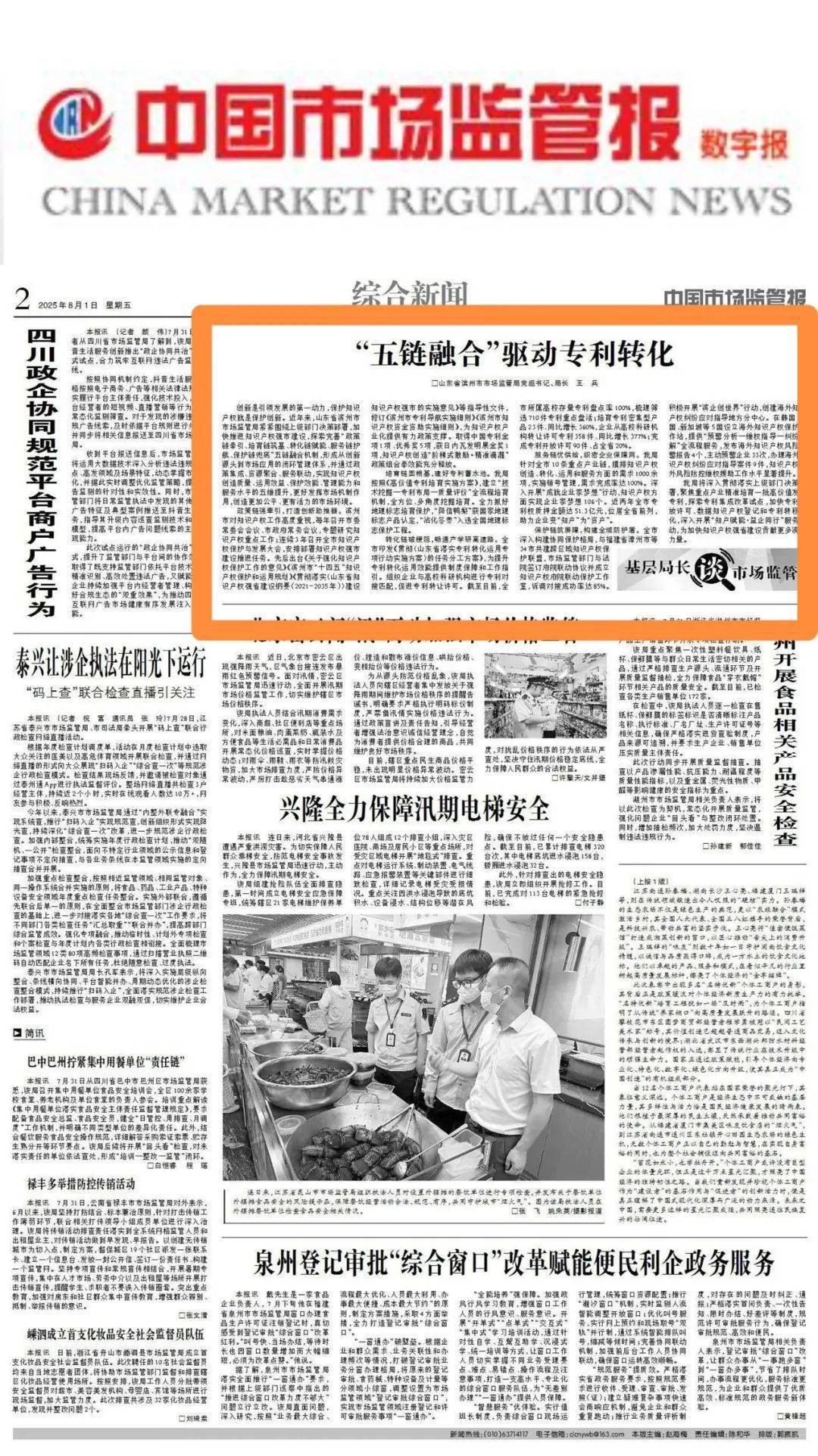 8月1日,《中国市场监管报》刊发,滨州市市场监督管理局党组书记、局长王兵署名文章《“五链融合”驱动专利转化》。