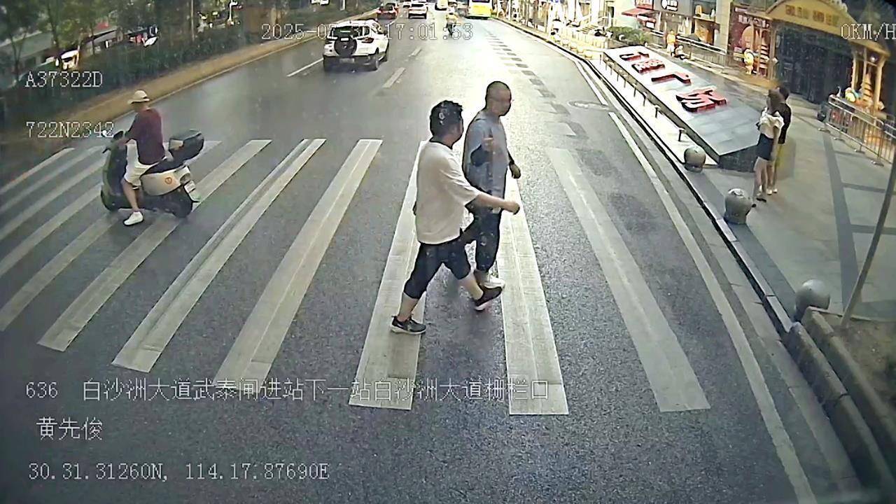 17时正值下班高峰,白沙洲大道路段车流如织。黄先俊驾驶636路公交车行至白沙洲大道武泰闸路段一处无信号灯斑马线时,远远看到多名行人正驻足斑马线起始点,望着往来车辆犹豫不前。黄先俊没有丝毫犹豫,当即轻点刹车,将车辆稳稳停在斑马线前,随即抬起手臂向行人方向左右来回挥手,示意大家放心通行。